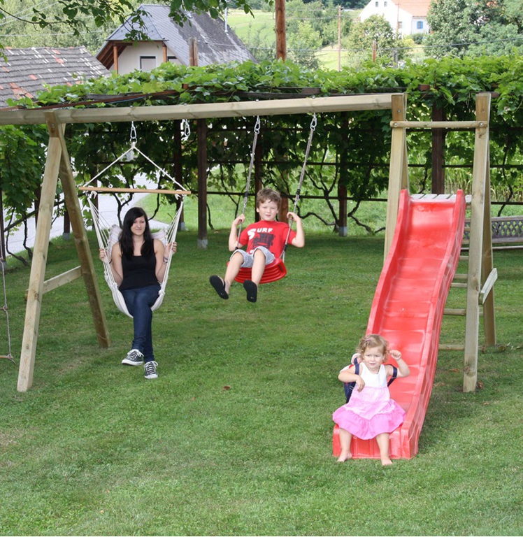 Vor allem auch für Kinder oder Junggebliebene lässt das Ferienhaus am Uhudlerweg nichts zu Wünschen übrig: ein neuer Kinderspielplatz und eine große Wiese lassen Kinderherzen höher schlagen.